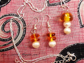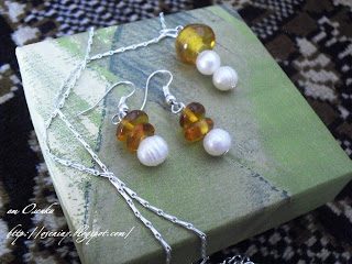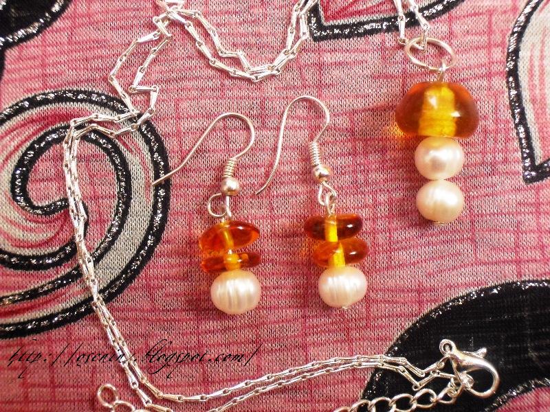 Это комплект из натурального янтаря и натурального жемчуга - кулон на посеребренной цепочке и сережки.