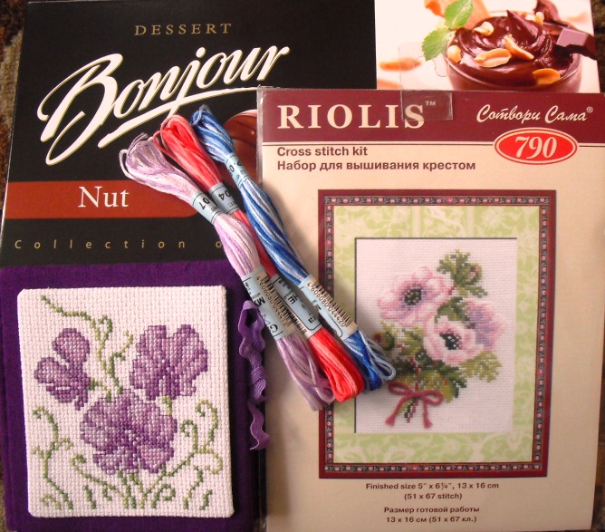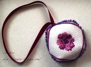 Не так давно я выиграла у Аллы "Сиреневую конфетку", куда входил набор c очень симпатичным душистым горошком (RТО Н082). Очень быстро его вышила и сразу же решила, что он станет украшением органайзера для иголочек и ножниц.