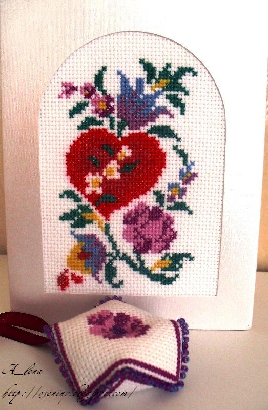 Дизайн Риолис 446, вышивала подбором шерстяными ниточками. Паспарту для открытки распечатала на фотобумаге. Вышивка крепится на двусторонний скотч, тесьму приклеила клеем "Момент Кристалл".