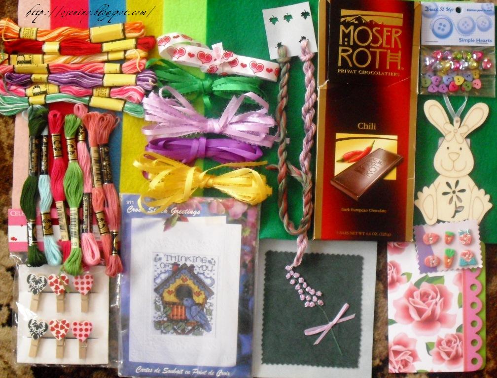 Ничего себе НЕ большой сюрпризик! Ленточки, 6 листов фетра, пуговки, мини-прищепочки с сердечками, ниточки DMC и меланжевые неизвестной мне фирмы Prism, набор вышивальный, подвесочка такая хорошенькая деревянная - уже висит, к Пасхе дом украшает ;)