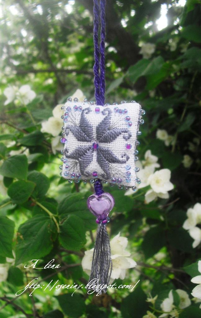 Материалы: ткань Линда К27, нитки "Ирис" серого и фиолетового цветов, металлик DMC E415, бисер Zlatka и чешский (№8 и №11), бусина-сердечко.
