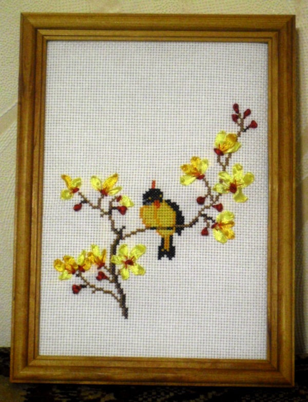 Совсем маленькая птичка, не знаю, как её зовут, и пока что нет окончательного оформления. Временно я поместила вышивку в деревянную рамочку без стекла. Не могу придумать, куда "приложить" мою птичку :))