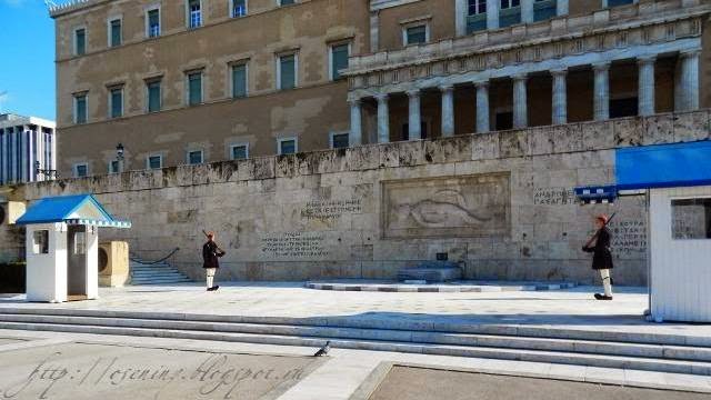 Каждый час проходит смена караула у могилы Неизвестного солдата, а через полчаса эвзоны меняются местами. Вообще-то, очень интересна история костюмов и строевого шага гвардейцев.