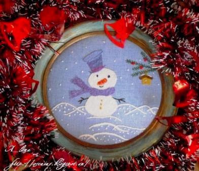 За три недели у меня появилась "Зимняя сказка". Вот такой снеговичок в стиле наив.